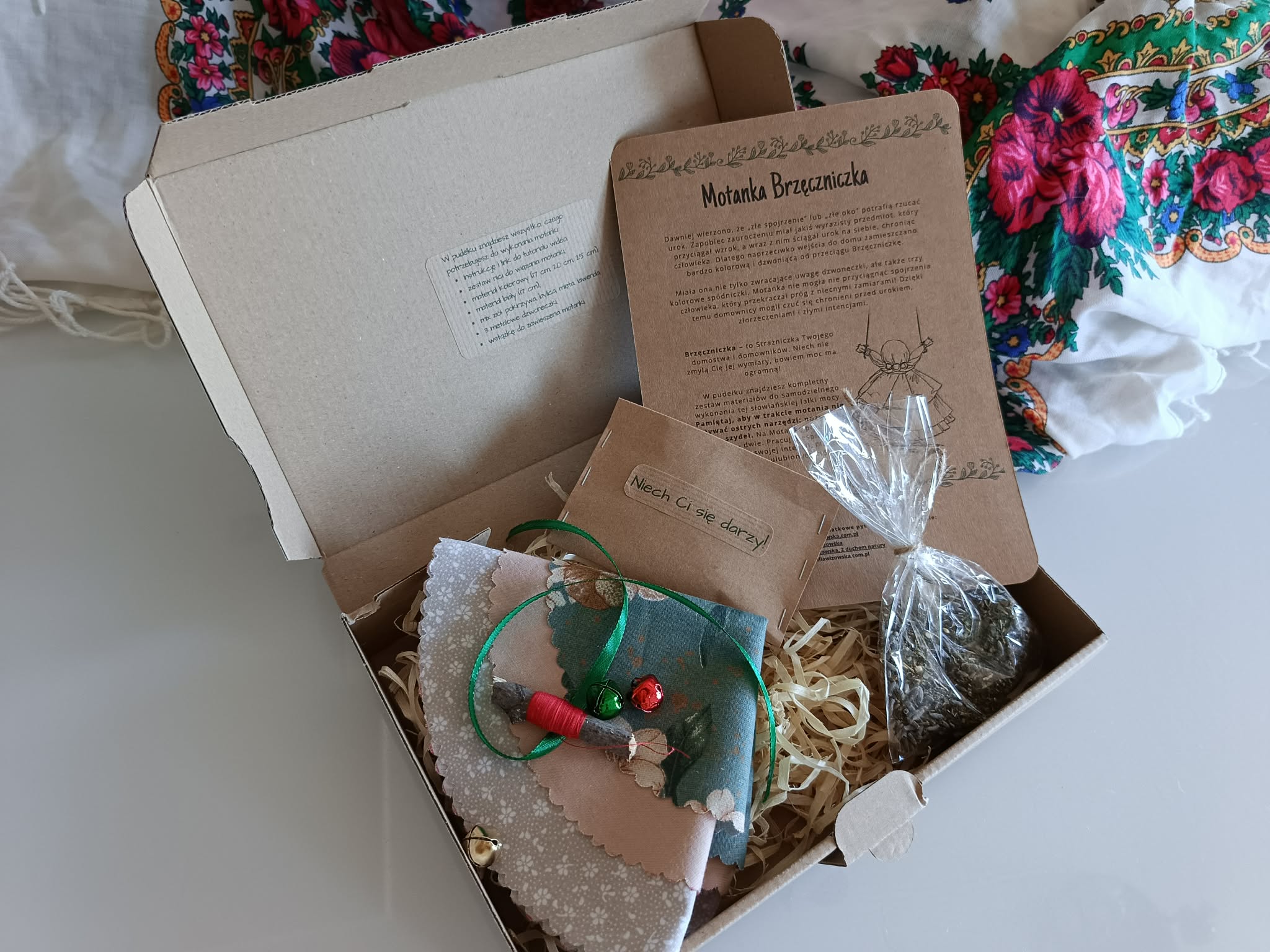 W pudełku znajdziesz kompletny zestaw materiałów do samodzielnego wykonania tej słowiańskiej lalki mocy: