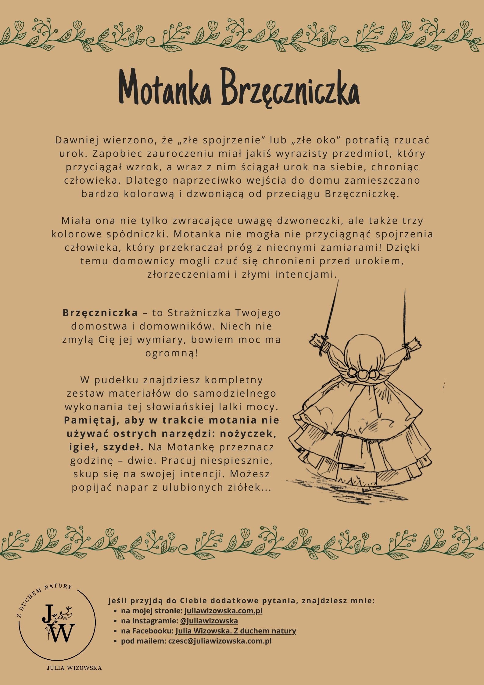 - kartka z dostępem do nagrania wideo, na którym opowiadam o Brzęczniczce (skąd wzięła się nazwa i dlaczego ta konkretna Motanka ma ochronną moc) i pokazuję, jak ją krok po kroku wykonać. Nagranie trwa 45 minut. Tę samą kartkę w formie PDF otrzymasz w mailu zwrotnym po złożeniu zamówienia.
