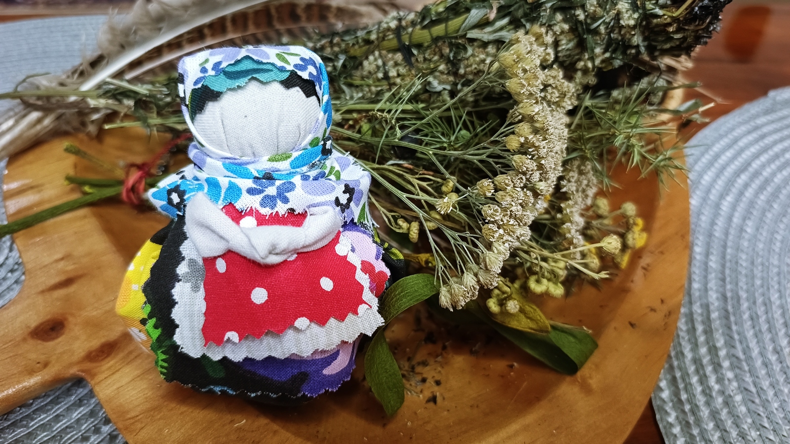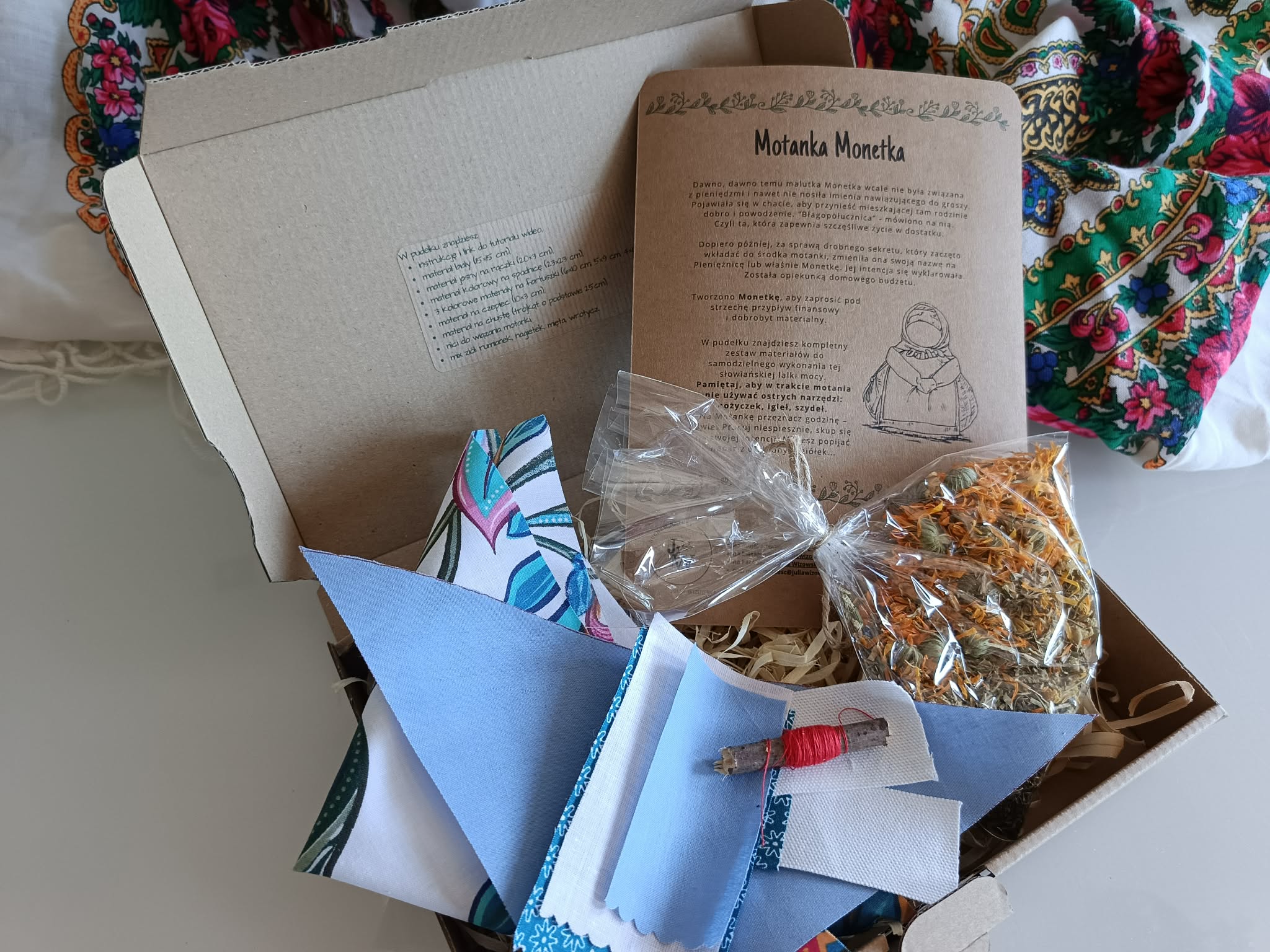 W pudełku znajdziesz kompletny zestaw materiałów do samodzielnego wykonania tej słowiańskiej lalki mocy: