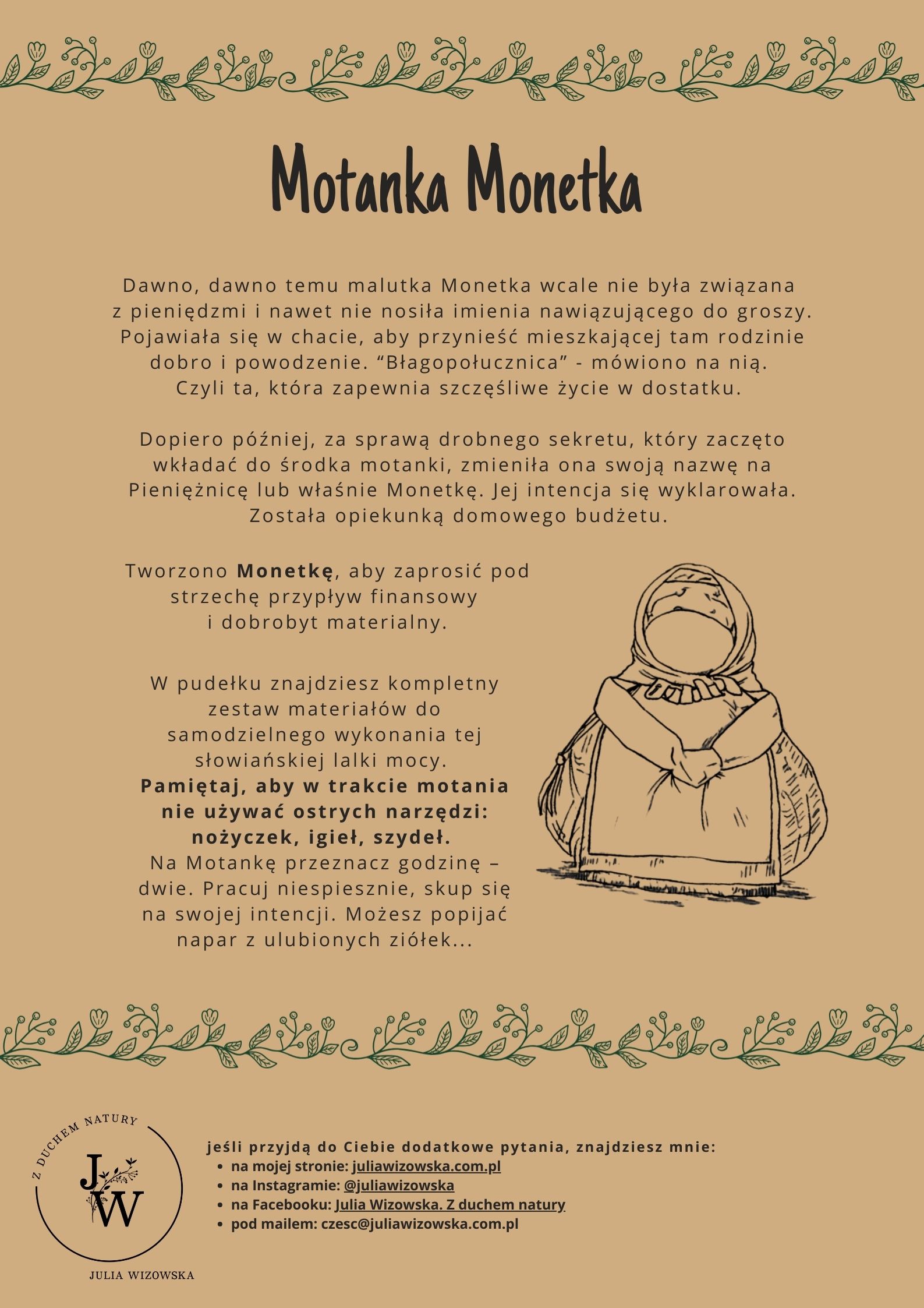 - ulotka z dostępem do nagrania wideo, na którym opowiadam o Monetce (skąd wzięła się nazwa i dlaczego tradycyjnie uważano, że ta konkretna lalka ma moc zapewniania powodzenia) i pokazuję, jak ją krok po kroku wykonać. Na tej samej ulotce znajdziesz dostęp do drugiego nagrania – to live na temat słowiańskich lalek intencyjnych w ogóle: co o nich wiemy, z jaką intencją powstawały, jakie istniały rodzaje i czego unikać, tworząc właną lalkę mocy. Ulotkę w formie PDF otrzymasz także w mailu zwrotnym po złożeniu zamówienia.